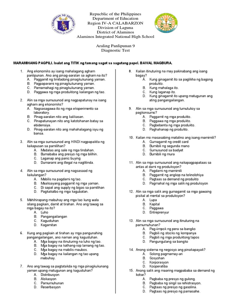 ARALING PANLIPUNAN 10 Diagnostic Test DRAFT. Araling panlipunan Other contents. Starting from Grade 7 to 10 of course these learners still need a hand especially when were stuck at the leap of dark in the upcoming school year.
