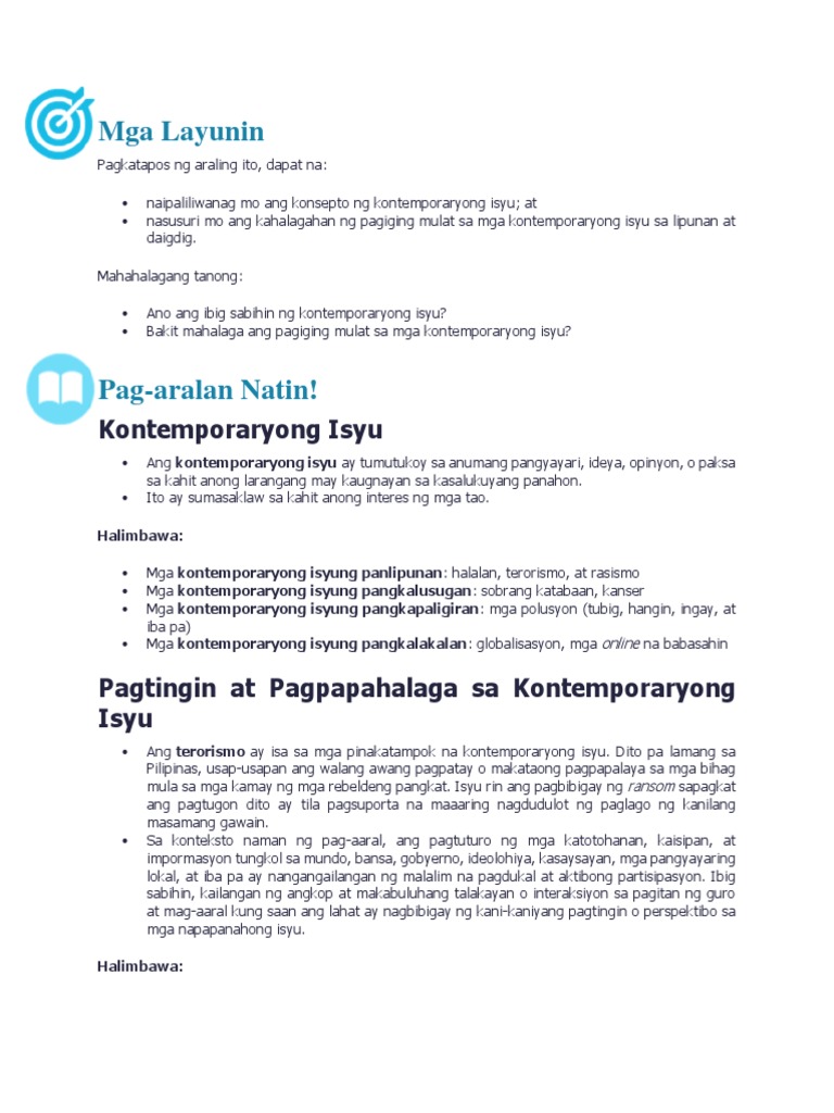 Ang kontemporaryong isyu ay tumutukoy sa anumang pangyayari ideya opinyon o paksa sa kahit anong larangang may kaugnayan sa kasalukuyang panahon. These links are monetized so just click them one at a time wait for 5 seconds then click Skip Ad and start downloading. Free downloadable Araling Panlipunan modules for junior high school students.