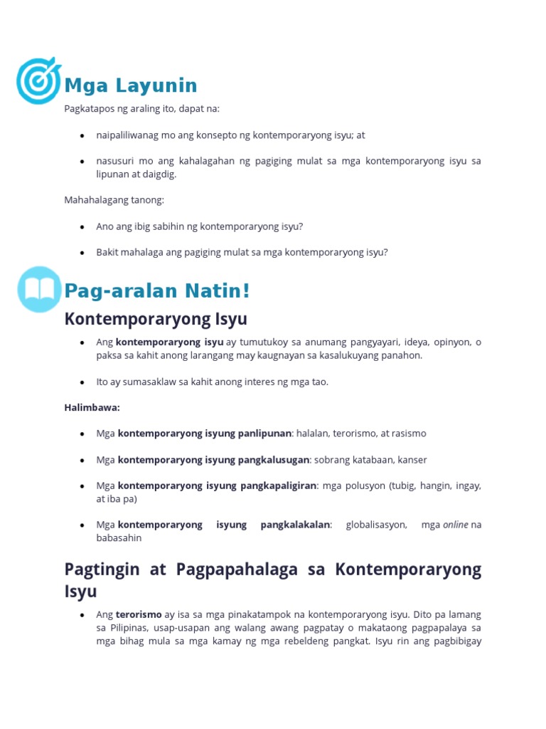 KONTEMPORARYONG ISYU Sa paksang ito ating aalamin kung ano nga ba ang kahalagahan ng mga kontemporaryong isyu at bakit ito kailangang pag-aralan. The cover has a nice smooth canvas texture and the illustrations are printed on high quality art matte paper. Ilan lamang sa mga mainit na kontemporaryung isyu ay ang pandemyang COVID-19.
